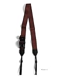 黒一色で小さなロゴタグが付いているだけのシンプルなデザインとネオプレーン製で肌触りが良く、プラスティックバックルの部分で簡単に取外し可能で、取り外した時は短い手持ちストラップとしても利用できるところが気に入っています。